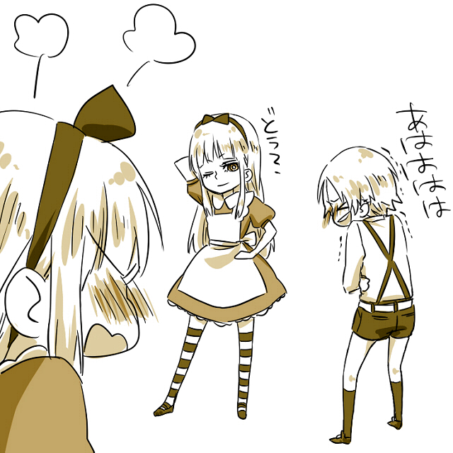 絵B 私そんなことしないもん!!正解は双子のディーでした双子のどっちかまでわかったあなたはこれでアリサー(アムラー的な)です←別に女装癖があるとかではなくただの遊びです一応モデルで女性服を普段から着てるんでねだから、彼らなら多分言われたものなんでも着てくれます帽子屋のとこに衣裳部屋ってのがあって大体のかつらや衣装はそこにそろってます