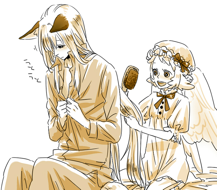絵 キツネさんはお疲れのようですキツネさんのサラサラ髪はカナリアの丹念なケアによって保たれておりますで、カナリアはいろんなパジャマを持ってるといいよ←あれ、そういえばカナリアは私の中で帽子屋宅まで仕事しに通ってる設定だったはずなのにいつのまにか住み着いてるな…《笑”まぁいっか←
