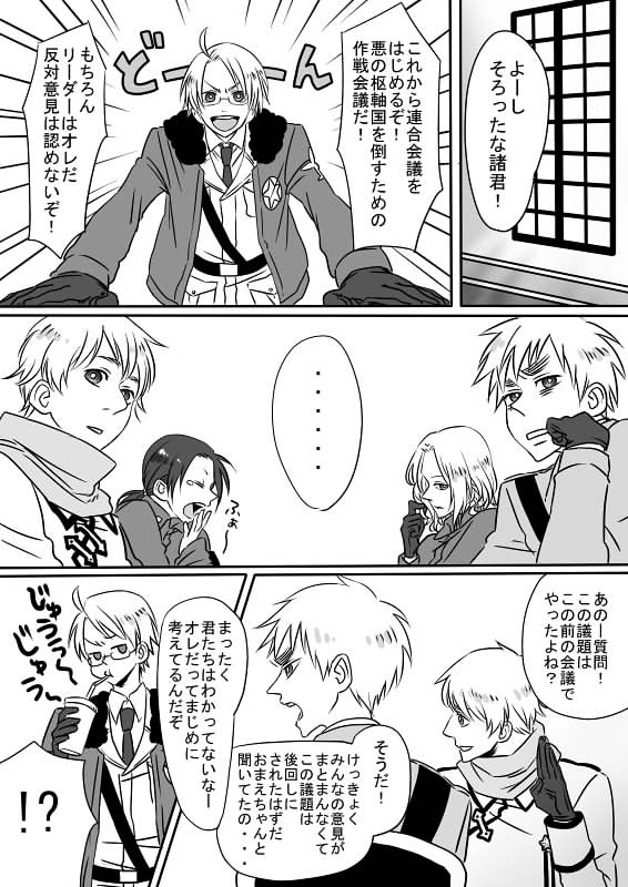 サンプル 漫画サンプル1ページ目だけお先に大公開!連合国たちがわいわいやってぎゃあああってなるお話←総ページ数14ページです素人漫画さーせん\(^q^)/ 9/19(日)大阪インテックス開催大阪世界会議5サークル名:おなかへった。スペース:A-17あ、一緒に参加する友人は私がこんな日記かいてること知らないんで秘密でお願いしま\(^q^)/←