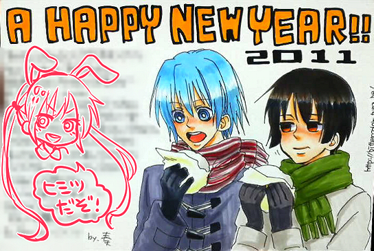 絵C:お披露目年賀状! 続いての年賀状ですリクはヘタリアだったので勝手に日本描きました←そして、ハヤテのごとく!のハヤテが大変好きだと伺ってたのでまた勝手にそのハヤテというキャラを描いてみたのはいいもののやっぱり、よく知らないキャラってのは似ないわけで\(^q^)/ちなみにウサ耳つけたピンクの絵はナギってキャラを描いてみたつもりがこれまた残念な…/(^q^)\そして、唯一変なウサギのマークを描き忘れてしまいました申し訳ないですorz