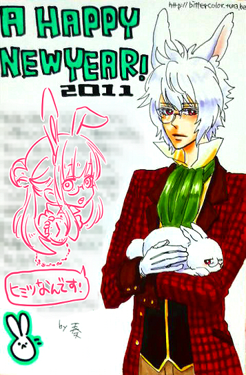 絵K:お披露目年賀状! 続いての年賀状ですリクはめずらしく単体白うさたんでした逆に難しかったです《笑”ただの棒立ちも面白くないので苦し紛れに白ウサうさぎを抱かせてみたり(^q^)←若干手が小さくなったのが…orzあ、左のは白ウサコスのアリスです皆さん、届いたときのは反応が人それぞれ、さまざまで面白いですね《笑”
