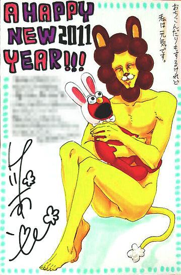 絵A:お披露目年賀状!番外編 続いての番外編年賀状ですこれを宛てた友人はある意味でケツポンの生みの親ですこの子が「ポンデライオンのリアルバージョン描いて」と言いださなければこの世にケツポンは生まれなかったでしょうちなみにこの子今ではなぜか年賀状を学校鞄に入れ登校してきてくれます《笑”なにか悩んでるときにこの年賀状を見るとそんな悩みはどうでもよくなるようでケツポン大活躍です\(^q^)/今ではテストに向けての勉強疲れをケツポンにふっ飛ばしてもらってるみたいです