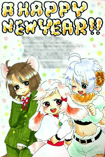 絵B:お披露目年賀状!番外編 続いての番外編年賀状ですこの友人からは以前から羊女というリクをいただいていてうさぎ年に羊だけを描くのもどうかと思い前につくったうさぎキャラとこの友人が好いていたネムリネズミを羊女風絵柄で描いてあげましたとても喜んでくれて良かったです´`*