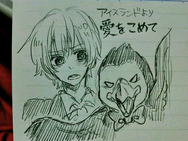絵:アイスランドより愛をこめて まず第一の感想パフィンうっせ!!《笑"もうパフィン歌ってない\(^q^)/パフィンの声でアイス君の声消える←そして意外とアイス君真面目に歌ってた←←アイス君は頑張ってアイスランドの宣伝してるのにパフィンはほぼ自分のことばっか歌ってた《笑"そして遠回しにけなされる眉毛に一人泣きそうになりました←